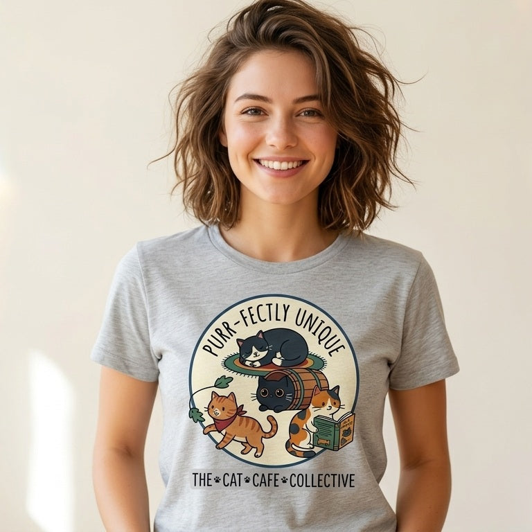 Join the club with 'The Cat Cafe Collective' apparel. Celebrating the unique charm of every feline, this 'Purr-fectly Unique' design brings the cozy vibes of your favorite cat cafe wherever you go. A delightful addition to any cat lover's wardrobe.