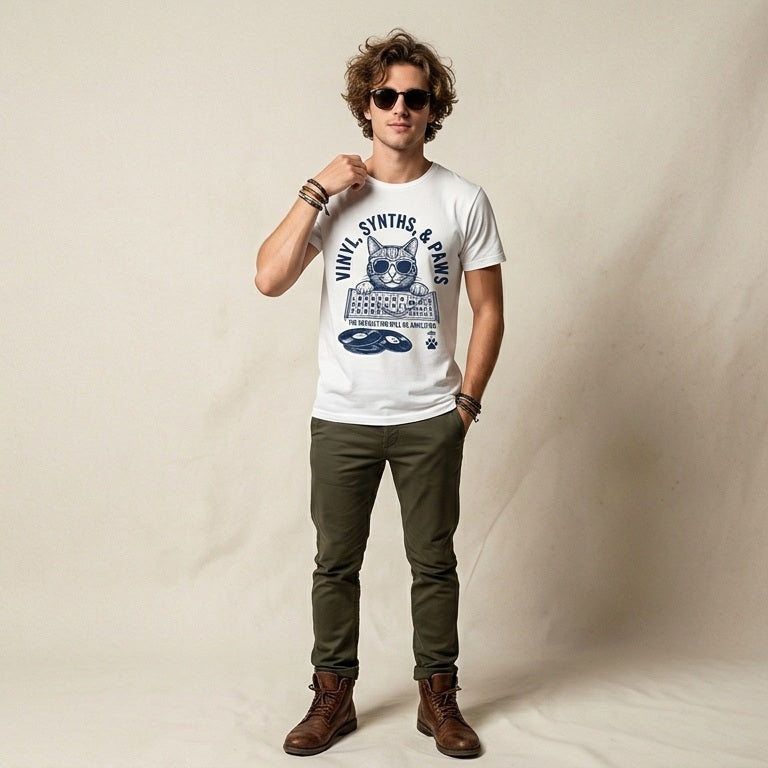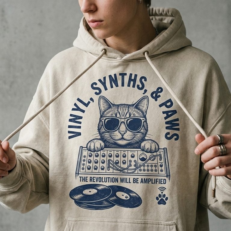 For the music-loving cat enthusiast, the Synthwave Feline Vinyl & Paws graphic is a must-have. Showcasing a cat at the synthesizer, this "Revolution Will Be Amplified" design hits all the right notes.